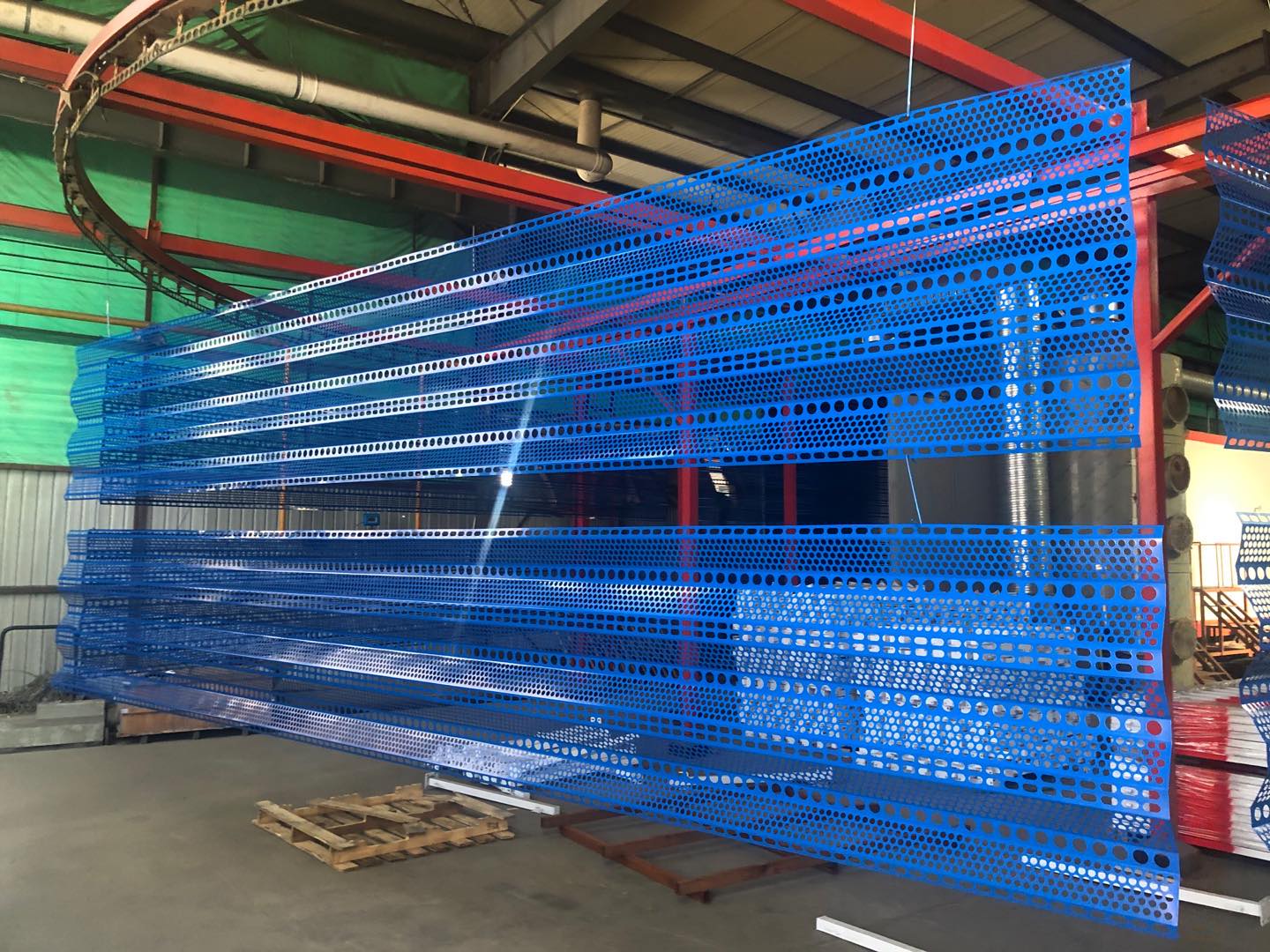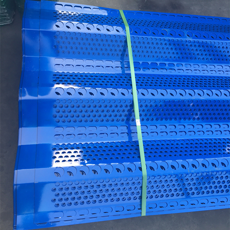 防風抑塵網是利用空氣動力學原理,按照實施現場環境風洞實驗結果加工成一定幾何形狀、開孔率和不同孔形組合擋風抑塵墻,使流通的空氣(強風)從外通過墻體時,在墻體內側形成上、下干擾的氣流以達到外側強風,內側弱風,外側小風,內側無風的效果,從而防止粉塵的飛揚。